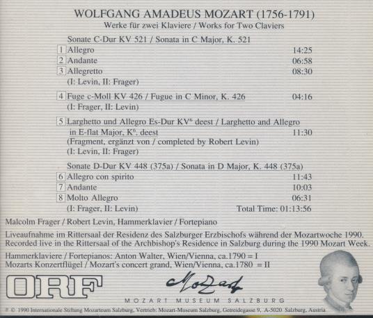 Recorded live in the Rittersaal of the Archbishop's Residence in Salzburg during the 1990 Mozart Week. Performers: Malcolm Frager / Robert Levin (Hammerklavier / Fortepiano). Fortepianos: Anton Walter, Vienna, ca.1790 = I; Mozart's concert grand, Vienna, ca.1780 = II. Total Time: 01:13:56.