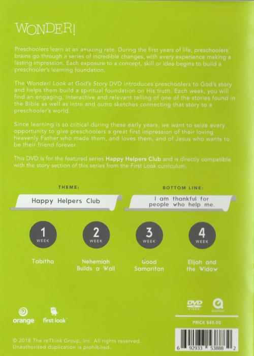 Preschoolers learn at an amazing rate. During the first years of life, preschoolers’ brains go through a series of incredible changes, with every experience making a lasting impression. Each exposure to a concept, skill, or idea begins to build a preschooler’s learning foundation.The Wonder! Look at God’s Story DVD introduces preschoolers to God’s story and helps them build a spiritual foundation on His truth. Each week, you will find an engaging, interactive and relevant telling of one of the stories found in the Bible as well as introductory and wrap up sketches connecting that story to a preschooler’s world. Since learning is so critical during these early years, we want to seize every opportunity to give preschoolers a great first impression of their loving heavenly Father who made them, and loves them, and of Jesus who wants to be their friend forever.