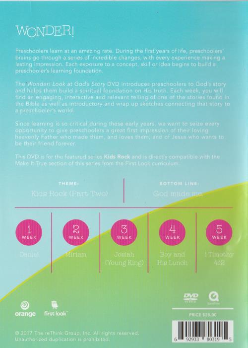 Preschoolers learn at an amazing rate. During the first years of life, preschoolers’ brains go through a series of incredible changes, with every experience making a lasting impression. Each exposure to a concept, skill, or idea begins to build a preschooler’s learning foundation.The Wonder! Look at God’s Story DVD introduces preschoolers to God’s story and helps them build a spiritual foundation on His truth. Each week, you will find an engaging, interactive and relevant telling of one of the stories found in the Bible as well as introductory and wrap up sketches connecting that story to a preschooler’s world. Since learning is so critical during these early years, we want to seize every opportunity to give preschoolers a great first impression of their loving heavenly Father who made them, and loves them, and of Jesus who wants to be their friend forever.