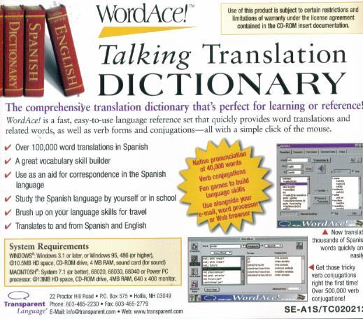 Spanish WordAce! is a fast, easy-to-use language reference that quickly provides word translations and related words, as well as verb forms and conjugations--all with a simple click of the mouse.