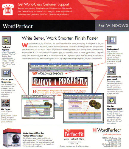 This version of the world's best-selling word processing software is the best, most revolutionary WordPerfect yet. From its unique graphical interface to its new spreadsheet capability, WordPerfect 6.0 has more of everything you want in quality word processing. Novice users can learn the program in no time at all and veteran users will feel right at home, with familiar keystrokes blending seamlessly with exciting new additions.