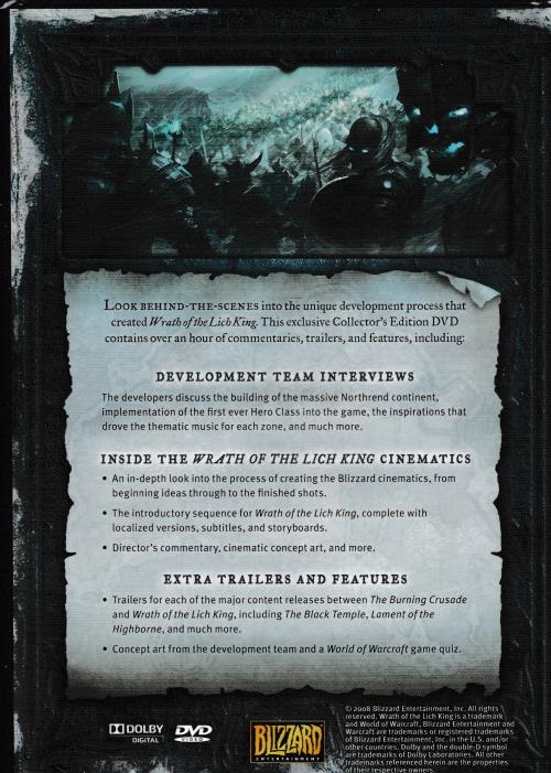 LOOK BEHIND-THE-SCENES into the unique development process that - created Wrath ofthe Lich King. This exclusive Collector's Edition DVD contains over an hour of commentaries, trailers, and features, including: DEVELOPMENT TEAM INTERVIEWS The developers discuss the building of the massive Northrend continent, implementation of the first ever Hero Class into the game, the inspirations that drove the thematic music for each zone, and much more. INSIDE THE WRATH OF THE LICH KING CINEMATICS • An in-depth look into the process of creating the Blizzard cinematics, from beginning ideas through to the finished shots. • The introductory sequence for Wrath of the Lich King, complete with localized versions, subtitles, and storyboards. • Director's commentary, cinematic concept art, and more. EXTRA TRAILERS AND FEATURES • Trailers for each of the major content releases between The Burning Crusade and Wrath of the Lich King, including The Black Temple, Lament of the Highborne, and much more. • Concept art from the development team and a World of Warcraft game quiz.