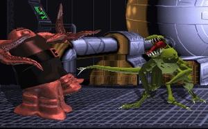Xenophage is a fighting game in the same genre as Mortal Kombat. This game features scrolling arenas that also zoom in and out, depending on how far apart the fighters are from each other. This is a unique feature in fighting games. The fighters all come from unique alien planets, so they look very cool and unusual. It's up to you to figure out their special abilities and moves.