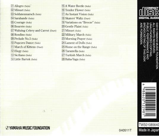 0 Allegro (solo) MI Minuet (Solo) Soldatenmarsch (Solo) E Sarabande (Solo) Courage (solo) Bourree (Solo) YAMAHA MUSIC FOUNDATION Waltzing Celery and Carrot (Duet) Rondino (solo) IN Prelude No.5 (Solo) E Popcorn Dance (Solo) 0 March of Kittens (Duet) E Elegy (solo) Siciliano (solo) El Little Bartok (solo) YAMAHA MUSIC FOUNDATION 15 A Water Beetle (Solo) 0 Tender Flower (Solo) E An Instant Vision (Solo) ID Skaters' Waltz (Duet) E Variations on "Breeze" (Solo) El Gentle Plaint (solo) E Minuet (Solo) E Military March (Solo) 1M Morning Prayer (solo) E Lament of Dolls (solo) a Home on the Range (solo) Tarantella (Solo) Turkish March (Solo) Baba-Yaga (Solo)