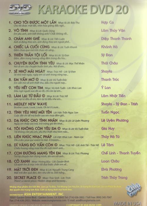 Karaoke DVD 20 features 20 Vietnamese songs performed by a variety of artists. The collection includes classic ballads, medleys, and popular contemporary tunes presented in karaoke format.