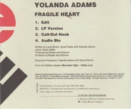 Yolanda Adams: Fragile Heart PROMO MUSIC AUDIO CD Gospel Edit LP Bio PRCD 1454-2