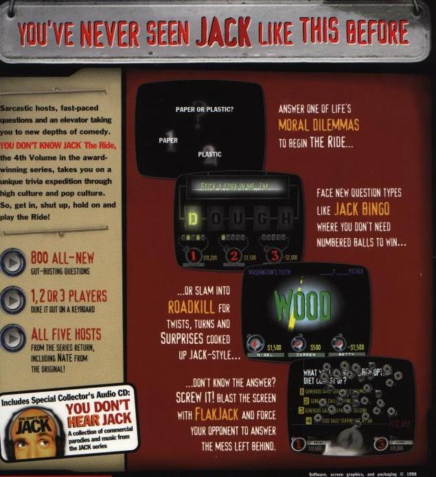 You Don't Know Jack Volume 4: The Ride contains over 800 new questions, five hosts (all returnees from the original series) and multi-player capability of up to three contestants, human or computer controlled. For fans of the series, a bonus CD is included in the package: You Don't Hear Jack which is a compilation of commercial parodies and other audio tracks from previous games. In the end, no matter what you know or what you don't know, you may discover still that You Don't Know Jack!