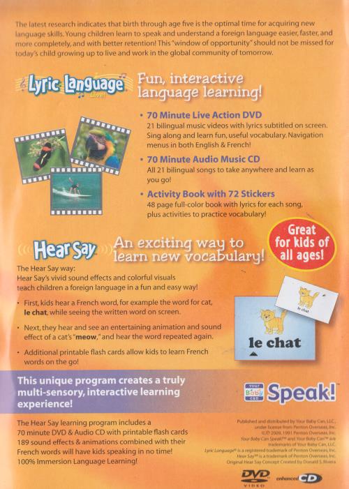 Program details: The Hear Say learning program includes a 70-minute DVD and audio CD with printable flash cards. 189 sound effects and animations combined with French words will have kids speaking in no time! 100Ͽmmersion language learning. Great for kids of all ages!