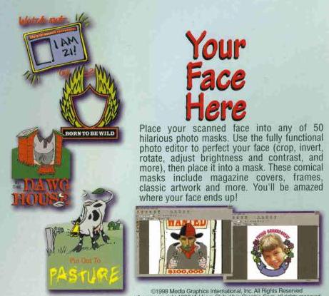 Place your scanned face into any of 50 hilarious photo masks. Use the fully functional photo editor to perfect your face (crop, invert, rotate, adjust brightness and contrast, and more), then place it into a mask. These comical masks include magazine covers, frames, classic artwork and more. You'll be amazed where your face ends up!