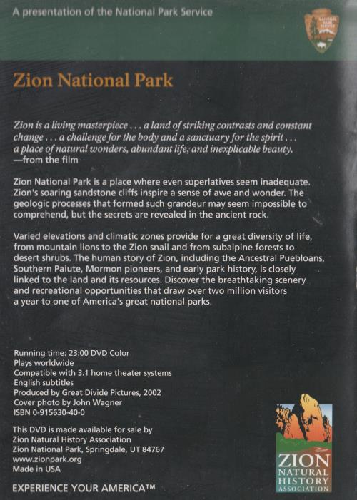 Zion National Park DVD VIDEO DOCUMENTARY nature hiking geology history scenery