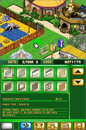 Players have the opportunity to create a living zoological park in their Nintendo DS with this port of Blue Fang Games breakthrough home computer hit. Building upon conventions of PC management simulations such as SimTheme Park and RollerCoaster Tycoon, Zoo Tycoon has the player laying out cages and enclosures for animal attractions, and placing pathways and landscaping for the people who come to see them. Good design will lead guests comfortably through the zoo, with refreshment stands and bathrooms set up in convenient locations among the attractions.