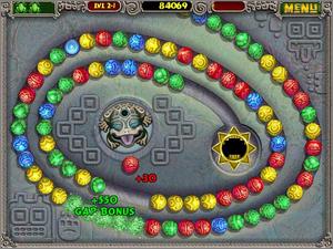 Zuma is an action puzzle game that puts the sphere-shooting, color-matching play of the Bust-A-Move games on a variety of patterned playing fields. Each playing field has a grooved channel that winds and twists about, and a stone frog "idol" in the center. Players have a top-down view of the action. A string of differently colored marbles slowly moves through the winding channel, from the outside of the board towards the frog in the center. The frog can be freely rotated, and players can shoot the differently colored marbles (which appear in its mouth) in any direction.